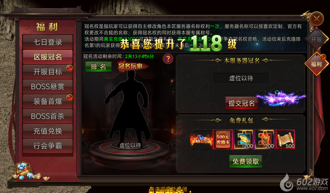活动期间:真实充值达1000可领取免费礼包,真实充值达3000获得争夺冠名权资格,活动结束后充值排名第1的玩家获得冠名权。(冠名权保留至月末最后一天24点)