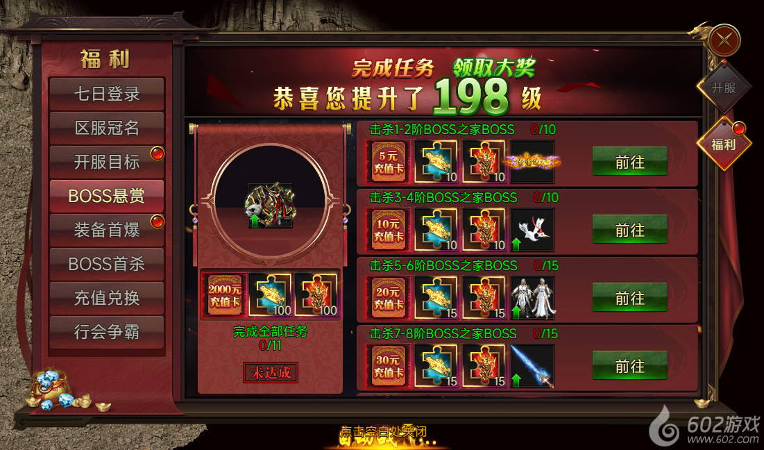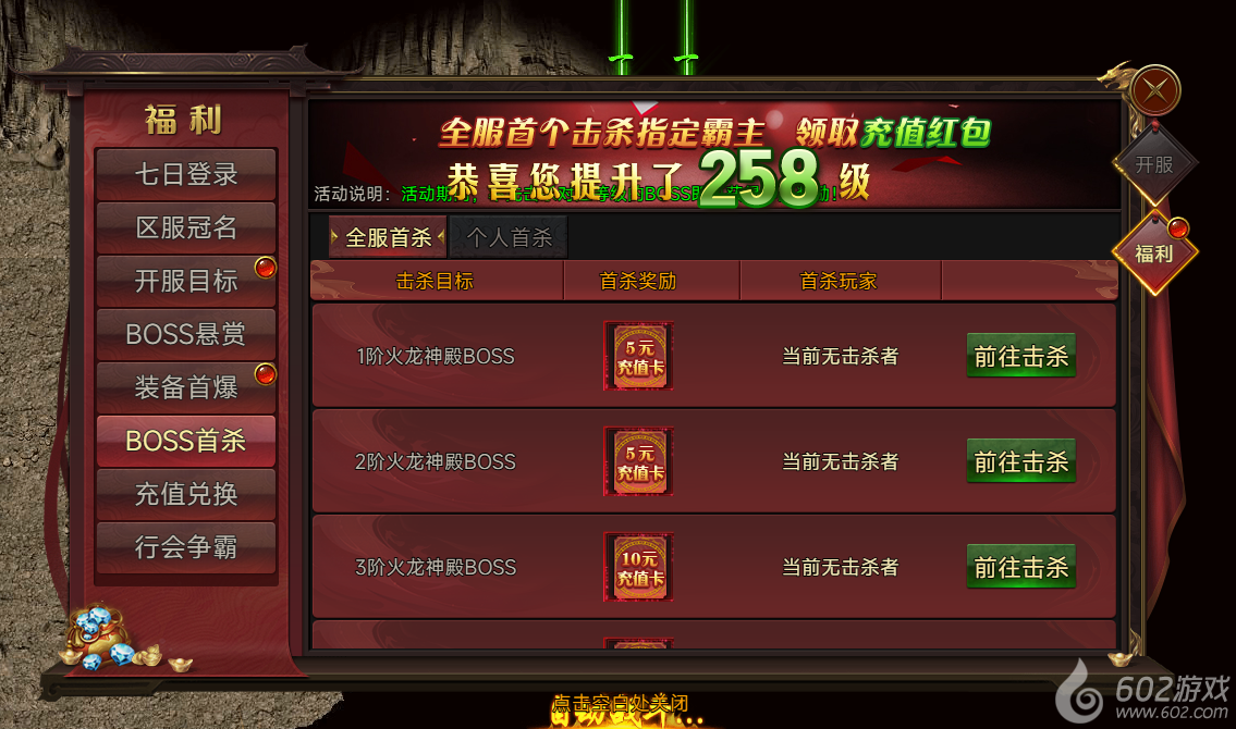 活动说明:活动期间,率先击杀对应等级的BOSS即可获得丰厚奖励!