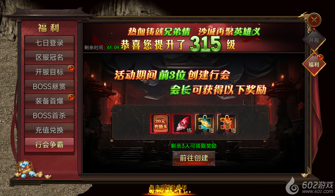 活动说明:活动期间,前3位创建行会,会长可获得奖励